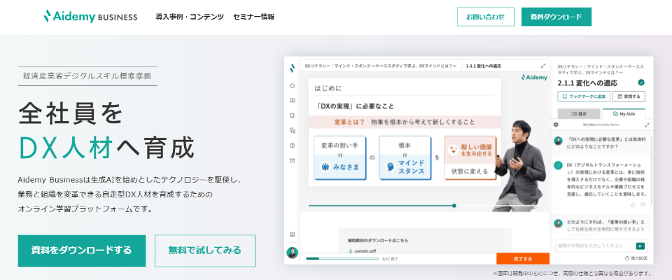 株式会社アイデミーが提供するオンラインDX人材育成サービス。今後のビジネスに欠かせないDX人材の教育・リスキリングに特化していることが特徴です。初学者向けの概論から実務経験者向けの高度な専門分野まで、目的や職種に合わせて幅広いコンテンツがそろっています。