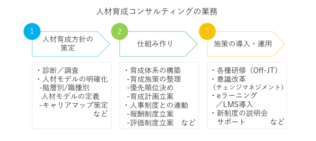 - 主な業務は、人材育成方針の策定、仕組み作り、施策導入・運用の3段階で企業を支援することです。