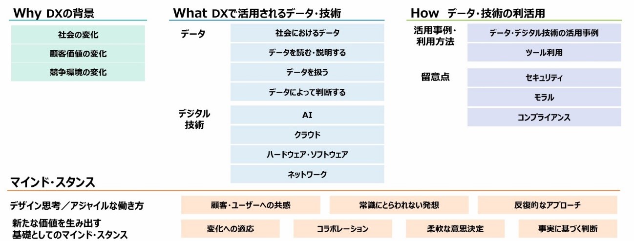 これらを策定した「DXリテラシー標準」は、DXの背景である「Why」、DXで活用されるデータ・技術としての「What」、データや技術の利活用に関する「How」、これらを総合して新たな価値を生み出す意識・姿勢・行動を定めた「マインド・スタンス」によって構成されています。