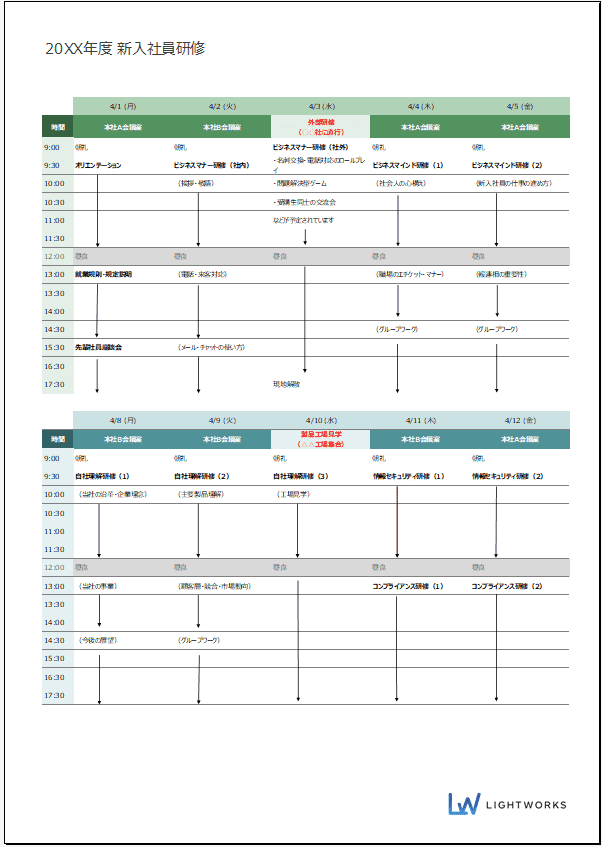 ⇒「新入社員研修スケジュールテンプレート(Excel)」をダウンロード
