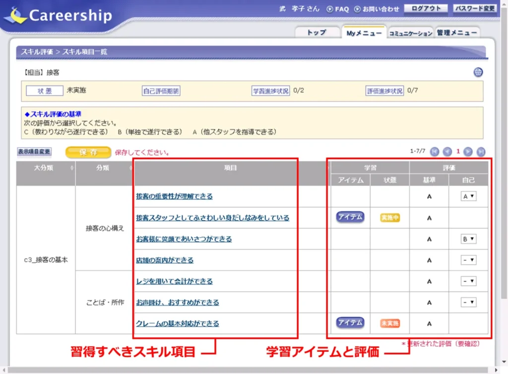 【スキル管理画面例(「接客」のスキル項目一覧)】