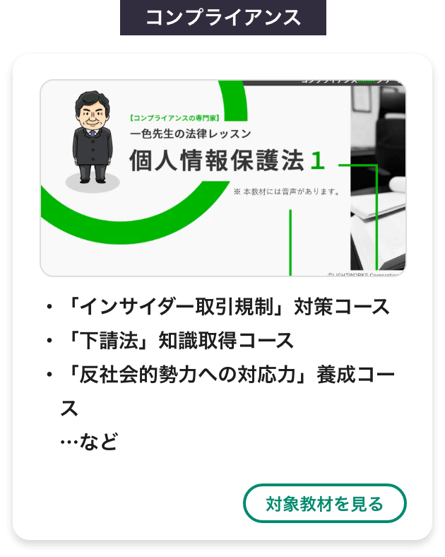 - 300タイトル1000本以上の豊富な教材をご用意しており、情報セキュリティ教育などの全社教育から階層別教育まで幅広く対応しています。